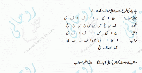اب اوپر سے نیچے سطر تخلیص کا حرف ، سطر موخر صدر اور سطر حروف ملفوظی حاصل شدہ کے اعداد ابجد ایقغ سے لے کر جمع کریں اگر تعداد مفرد نہ ہوں تو باہم آپس میں جمع کرلیں مثلا ع کے عدد 7 ، ک کے عدد 2 ، د کے عدد 4 کل 13 عدد ہوئے جو کہ مفرد نہیں ہے لہٰذا انہیں باہم جمع کیا تو 1+3=4حاصل ہوئے یہ اعداد سطر کے نیچے لکھتے جائیں اس طرح سے اعداد کی ایک نئی سطر قائم ہوجائے گی ۔ ان اعداد کو ابجد قمری میں دیکھتے ہوئے حروف لکھتے جائیں ۔ ان حروف کو دو مرتبہ ترفع حرفی کرلیں یہ ایک نئی سطر حروف ظاہر ہوگی ۔ اس نئی سطر کے پیدا شدہ حروف کو ملفوظی صورت میں لکھ لیں اب چار چار کی گنتی سے حروف اٹھاتے جائیں گنتی اس وقت تک جاری رکھیں جب تک سطر ختم نہ ہوجائے ۔ یہ جو حروف حاصل ہونگے یہ جوابیہ حروف ہونگے اس سطر ہر حرف یا تو خود ناطق ہوگا یا اس کا نظیرہ ۔ اس قاعدہ میں تکرار حروف دوران حاصل کردن جواب کے حذف کی جا سکتی ہے تمام بیان کو مثال سے سمجھا رہا ہوں غور کریں ۔